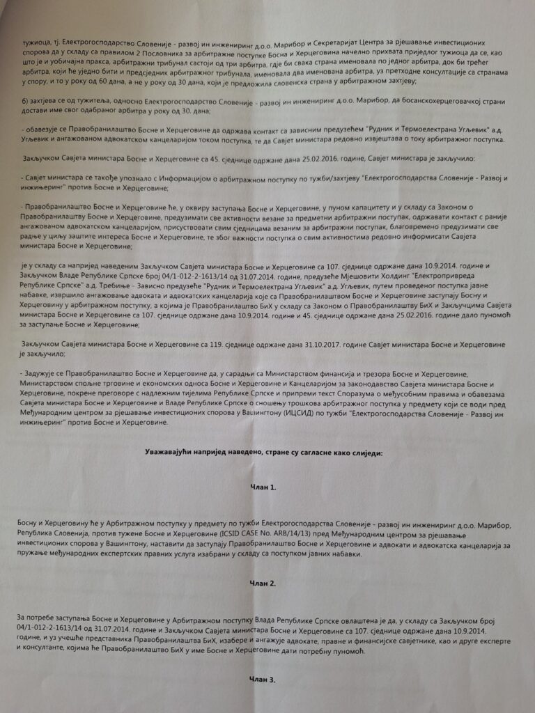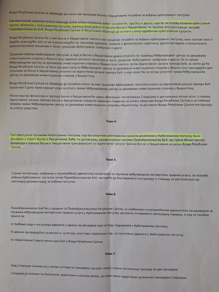 У члану 3. и 4. се наводи да се Влада Републике Српске безусловно обавезује да ће сву евентуалну новчану накнаду штете или изгубљену добит са каматом исплатити у року одређеном арбитражном одлуком, као и да ће усљед евентуалног добитка арбитражог спора новац бити уплаћен на рачун Владе Републике Српске.