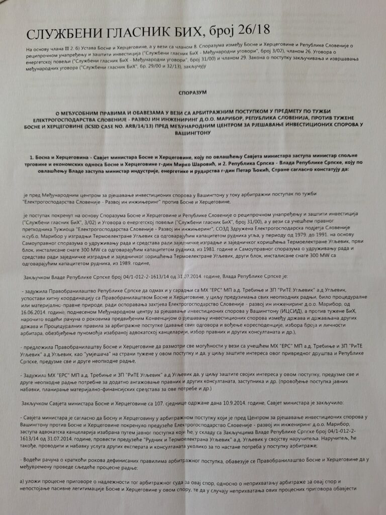 „Послије губитка од око 110 милиона марака усљед губитка арбитражног спора од фирме ‘Вијадукт’ и послије потенцијалне исплате фирми ‘Комсар енерџи’ од 240 милиона марака, у Вашингтону се води нови спор против Републике Српске по тужби Електрогосподарства Словеније у износу од око 695 милиона евра“, наводи Бодирога.